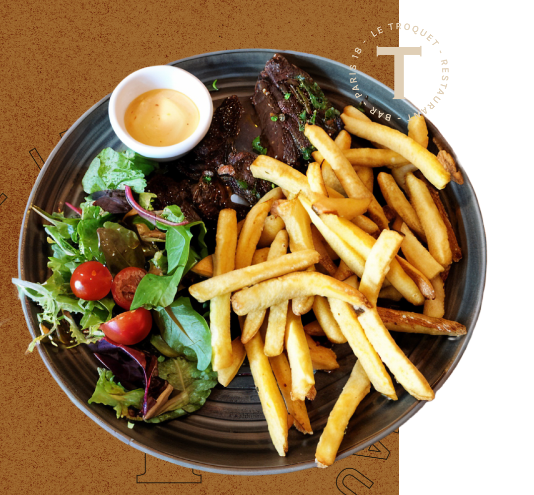 La cuisine du Troquet s’inscrit dans la tradition du bistrot parisien, avec des plats typiquement français, des salades, des burgers, des croques-monsieur et une cuisine 100 % maison. Chaque assiette est pensée pour accompagner un moment de partage, que ce soit avant un match retransmis ou une soirée dansante improvisée.